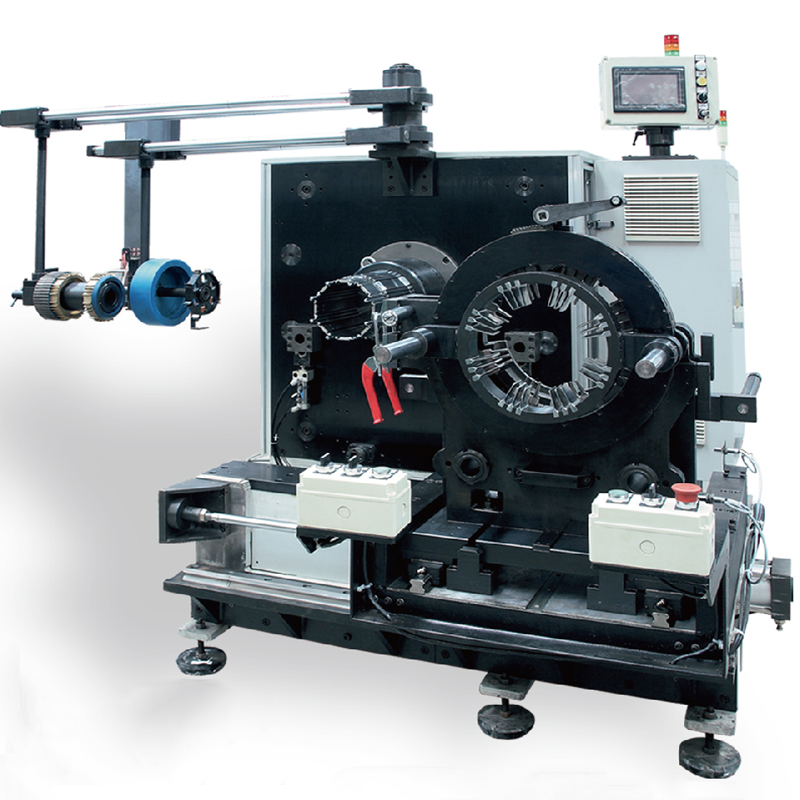 插入:采用机械、气动传动系统,交流伺服电机驱动系统,PLC集成控制系统,完成定子自动压紧、推线、机构传动及换向、楔纸保护等功能,同时可实现工位通过滑台进行交换、挂线、定子安装和拆卸。具有人机界面,具有故障显示、故障报警及各种参数设置等功能,具有自动化程度高、效率高、操作方便、工作可靠等优点。
